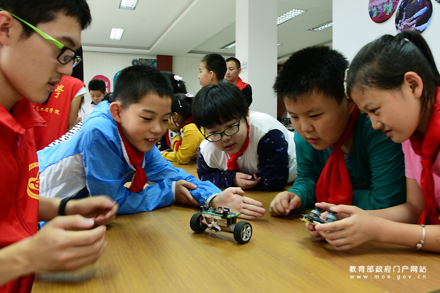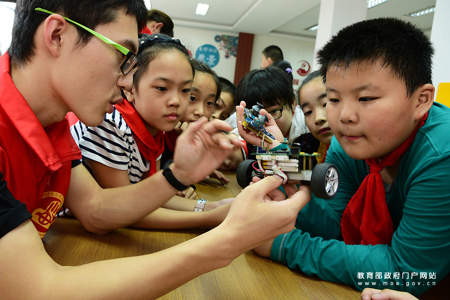 志愿者在指導小學生操作體驗智能科普模型“平衡小車”。(石玉成/攝)