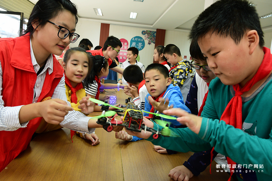 志愿者在為小學生講解智能科普模型“四旋翼飛行器”的功能。(石玉成/攝)