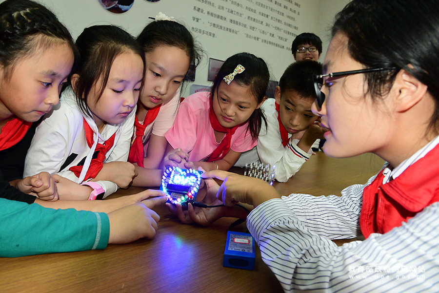 志愿者在為小學生講解智能科普模型“愛心燈”的功能。(石玉成/攝)