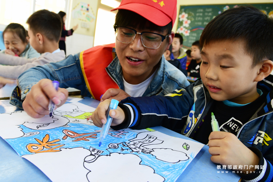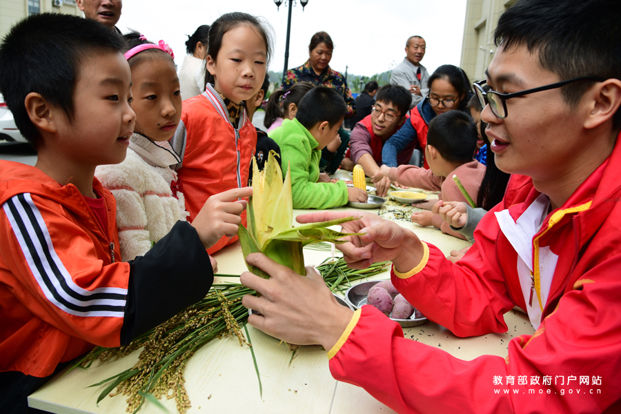 1/0江蘇大學(xué)志愿者在為小朋友講解玉米的生長(zhǎng)過(guò)程。(石玉成 杜康/攝)