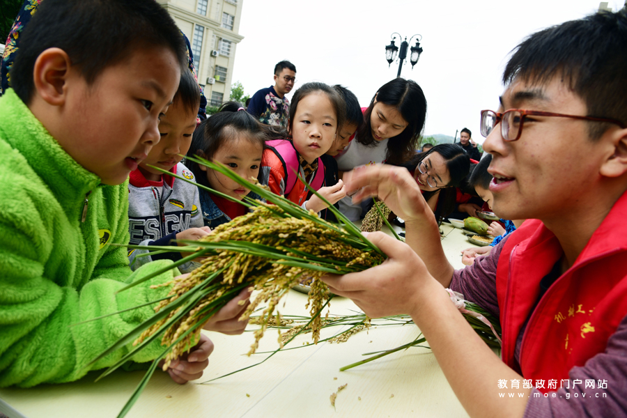 1/0江蘇大學(xué)志愿者在為小朋友講解水稻的生長(zhǎng)過(guò)程。(石玉成 杜康/攝)