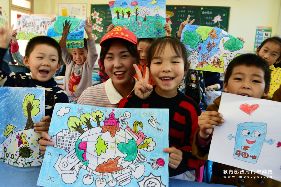 1/0小學(xué)生和志愿者在展示創(chuàng)作的環(huán)保繪畫(huà)作品。(石玉成 趙彥婷/攝)
