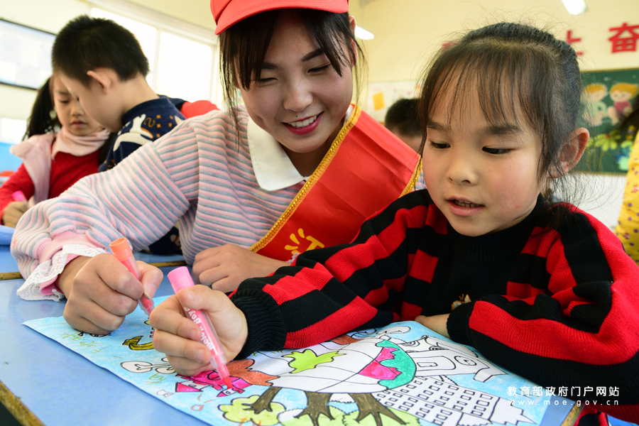 1/0志愿者在指導(dǎo)小學(xué)生描繪環(huán)保畫(huà)。(石玉成 趙彥婷/攝)