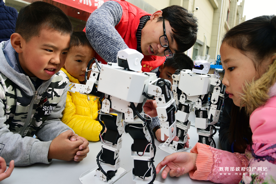 志愿者在為小朋友講解機(jī)器人的功能。(石玉成 杜康/攝)