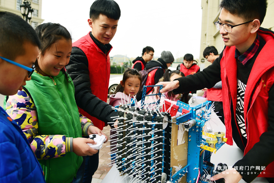 志愿者在指導(dǎo)小朋友體驗(yàn)“救援”機(jī)器人的功能。(石玉成 杜康/攝)