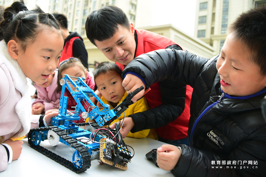 志愿者在指導(dǎo)小朋友操作“攻堅(jiān)戰(zhàn)”機(jī)器人。(石玉成 杜康/攝)