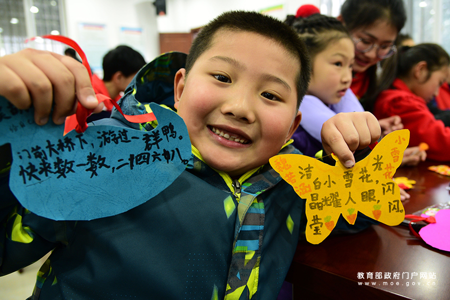 1/0一名小朋友在展示制作好的童謠書簽。(石玉成 肖怡晨/攝)