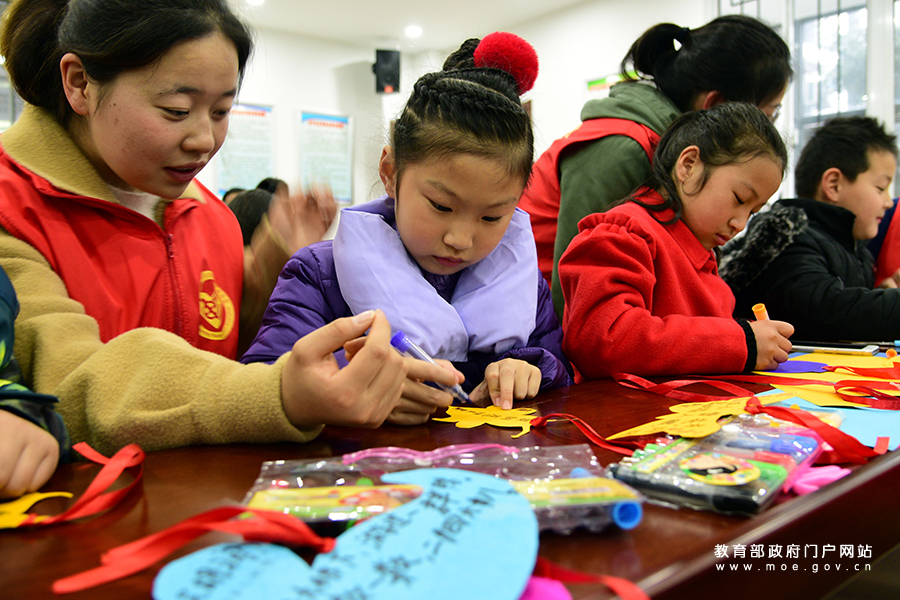 1/0大學(xué)生志愿者在指導(dǎo)小朋友制作童謠書簽。(石玉成 肖怡晨/攝)