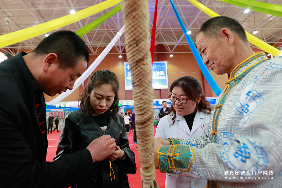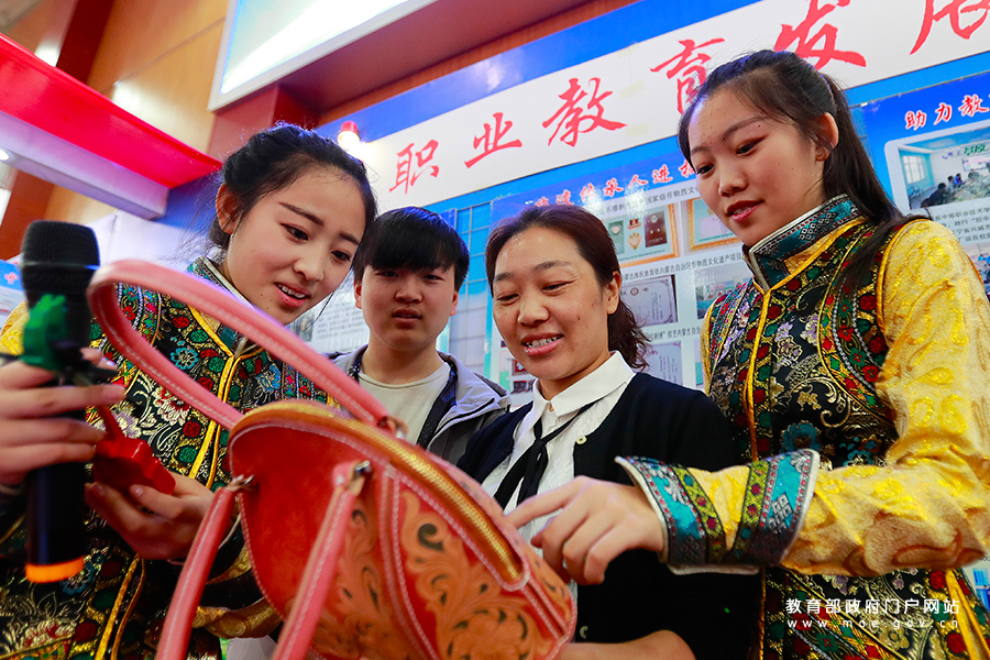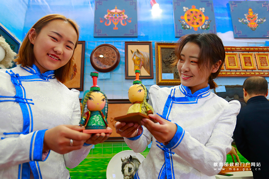 在技能成果展上,錫林郭勒職業(yè)學(xué)院學(xué)生展示她們制作的民族工藝品。(張學(xué)軍/攝)