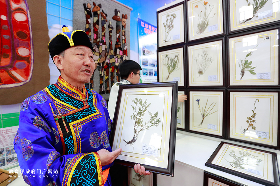 在技能成果展上,呼倫貝爾職業(yè)技術(shù)學(xué)院蒙醫(yī)醫(yī)藥系老師向觀眾介紹神奇的蒙藥。(張學(xué)軍/攝)