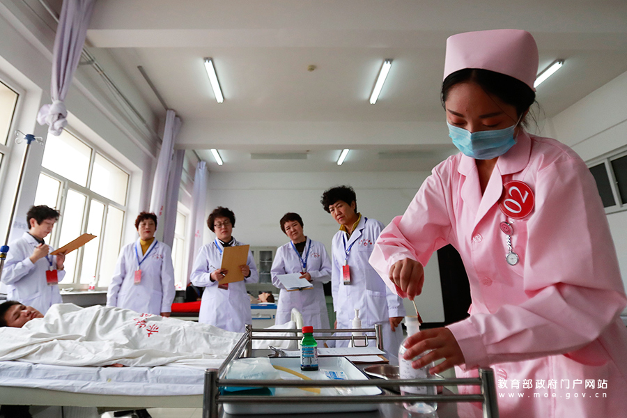 醫(yī)藥衛(wèi)生類護理項目選手在緊張比賽中。(張學(xué)軍/攝)