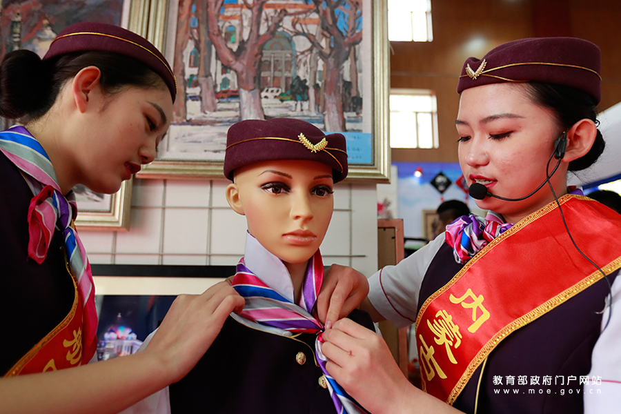 內(nèi)蒙古航空職業(yè)技術(shù)學(xué)校學(xué)生演示著裝禮儀技能。(張學(xué)軍/攝)