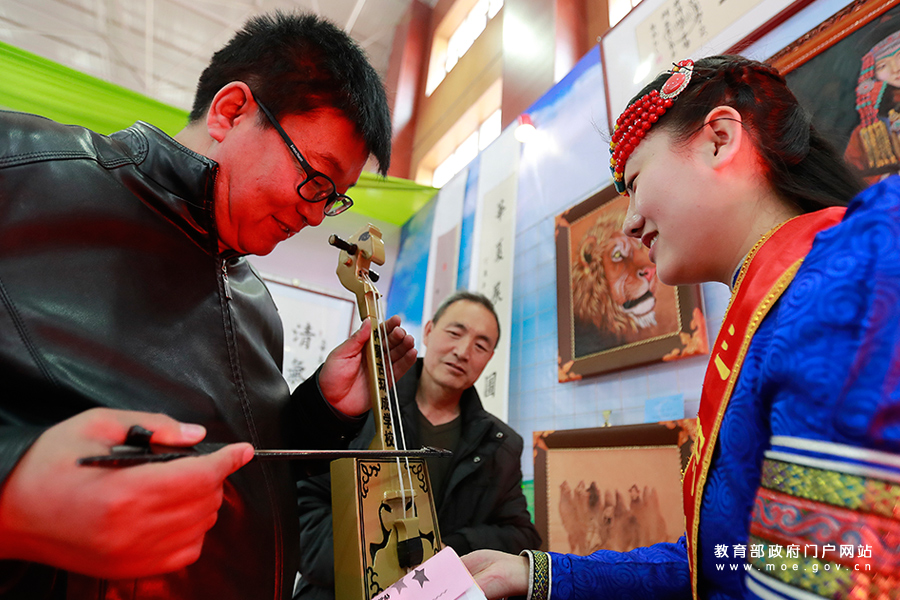 在技能成果展上,一名觀眾對內(nèi)蒙古環(huán)城學(xué)校制作的馬頭琴產(chǎn)生深厚興趣。(張學(xué)軍/攝)