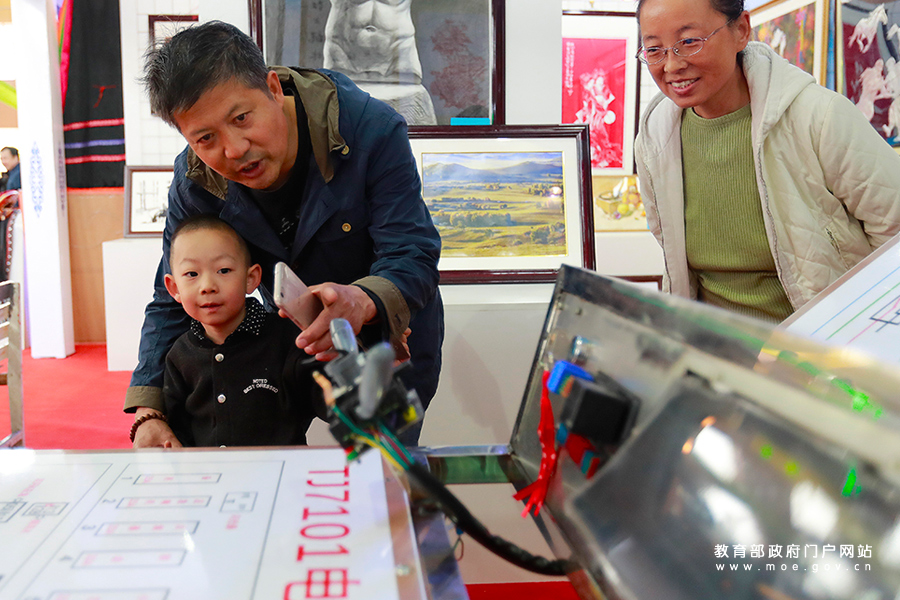 通遼市高級技工學(xué)校展位前,一名家長向孩子介紹參展作品 。(張學(xué)軍/攝)