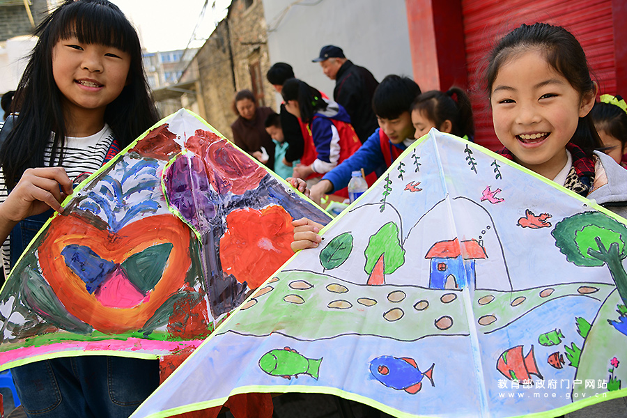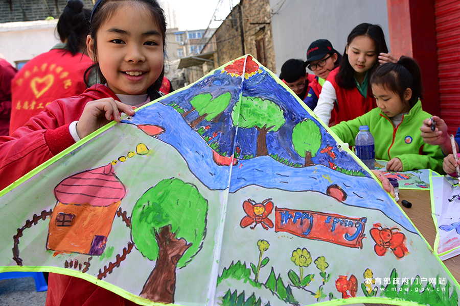 1/0小朋友在展示描畫(huà)好的風(fēng)箏。(石玉成 周存君/攝)