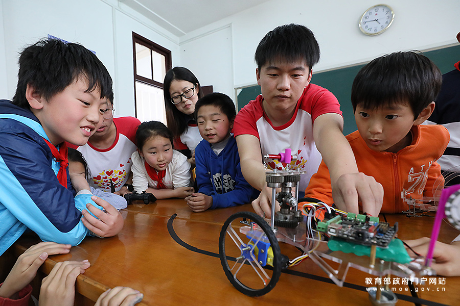 1/0大學(xué)生志愿者在“四點(diǎn)鐘學(xué)?!睘樾W(xué)生演示智能機(jī)器人。家長(zhǎng)六點(diǎn)才下班,孩子三點(diǎn)半放學(xué)了怎么辦?這一難題在江蘇大學(xué)附屬學(xué)校得到了解決。從2012年開始,江蘇大學(xué)關(guān)心下一代工作委員會(huì)聯(lián)合江蘇大學(xué)附屬學(xué)校成立了“四點(diǎn)鐘學(xué)?!?,由江蘇大學(xué)20余名退休教師輪流擔(dān)任志愿者,每天幫助照看不能被家長(zhǎng)及時(shí)接走的小學(xué)生,輔導(dǎo)他們完成作業(yè),解答孩子們的問(wèn)題?!八狞c(diǎn)鐘學(xué)?!背闪⒘陙?lái),一些大學(xué)生也陸續(xù)加入到志愿者隊(duì)伍中,為孩子們不定期開展科學(xué)實(shí)驗(yàn)、手工制作、文學(xué)藝術(shù)等素質(zhì)拓展活動(dòng),累計(jì)讓400余名小學(xué)生受益于“四點(diǎn)鐘學(xué)?!?,讓家長(zhǎng)安心工作,解決了困擾他們的“三點(diǎn)半難題”。(楊雨/攝)