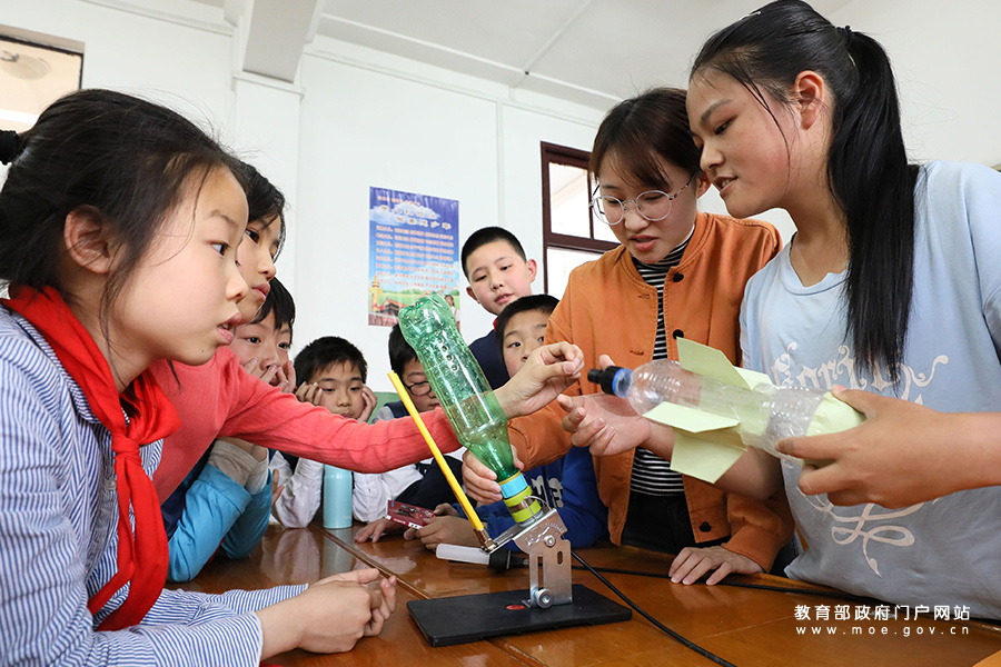 1/0大學(xué)生志愿者在“四點(diǎn)鐘學(xué)?!睘樾W(xué)生講解“水火箭”的原理。(楊雨/攝)