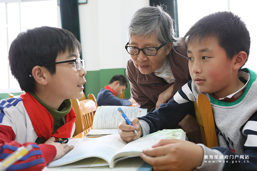 1/0退休教師在“四點(diǎn)鐘學(xué)校”輔導(dǎo)小學(xué)生寫作業(yè)。(楊雨/攝)