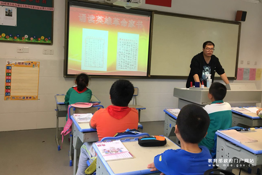 上海市崇明區(qū)長興小學四年級利用晨會組織學生誦讀英雄革命家書。(上海市崇明區(qū)長興小學/供)