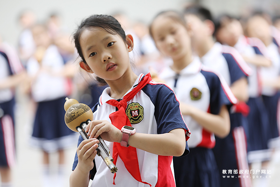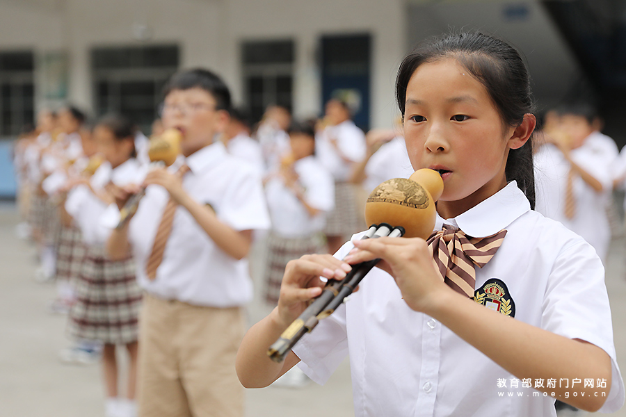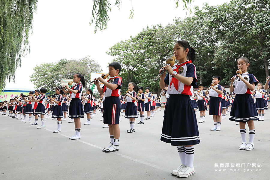 河南省溫縣第二實(shí)驗(yàn)小學(xué)學(xué)生在校園里合奏葫蘆絲。(徐宏星/攝)