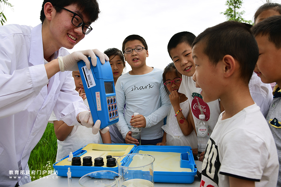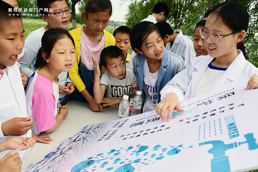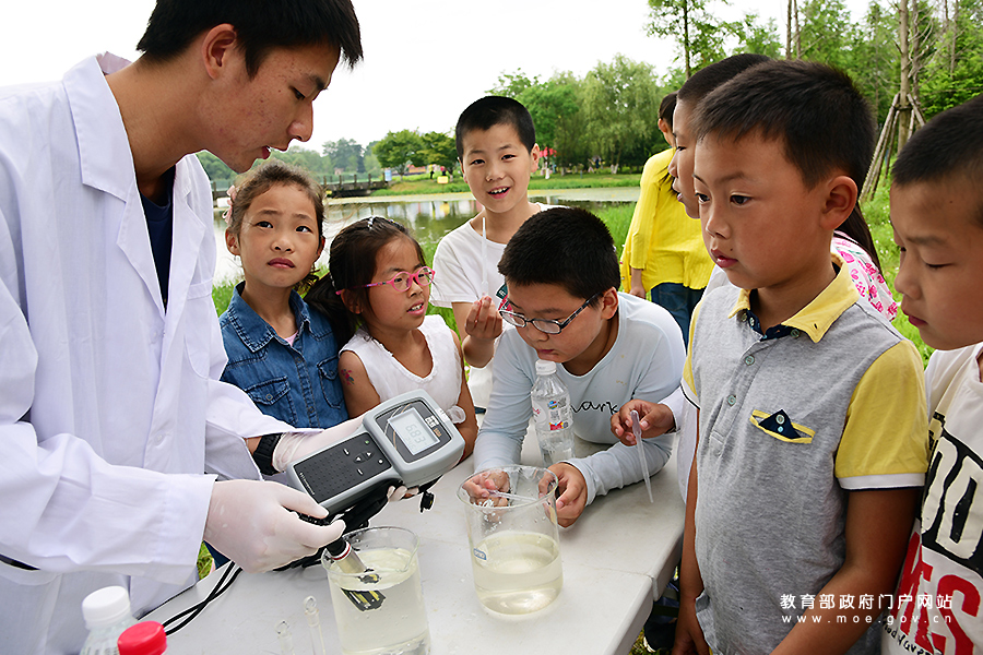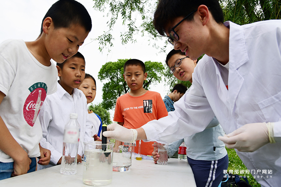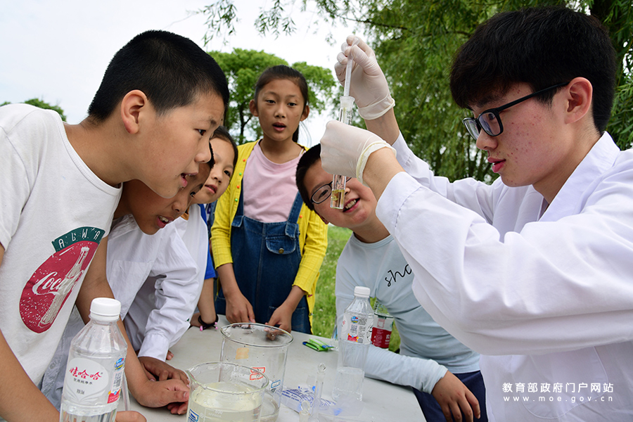 1/0江蘇科技大學(xué)志愿者在為小朋友演示對(duì)比不同水樣的濁度。2018年6月3日,江蘇科技大學(xué)志愿者與鎮(zhèn)江市和平路街道征潤(rùn)州社區(qū)的小朋友一起來到金山湖水源地,開展“保護(hù)水資源 環(huán)保伴我行”活動(dòng),通過對(duì)湖水、純凈水等不同水樣的測(cè)試與環(huán)保知識(shí)宣講,增強(qiáng)孩子們對(duì)水資源的節(jié)約和環(huán)保意識(shí),迎接6月5日世界環(huán)境日的到來。(石玉成 喻永光/攝)