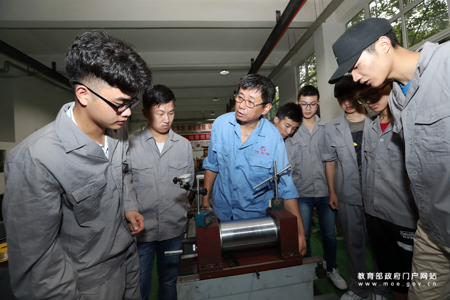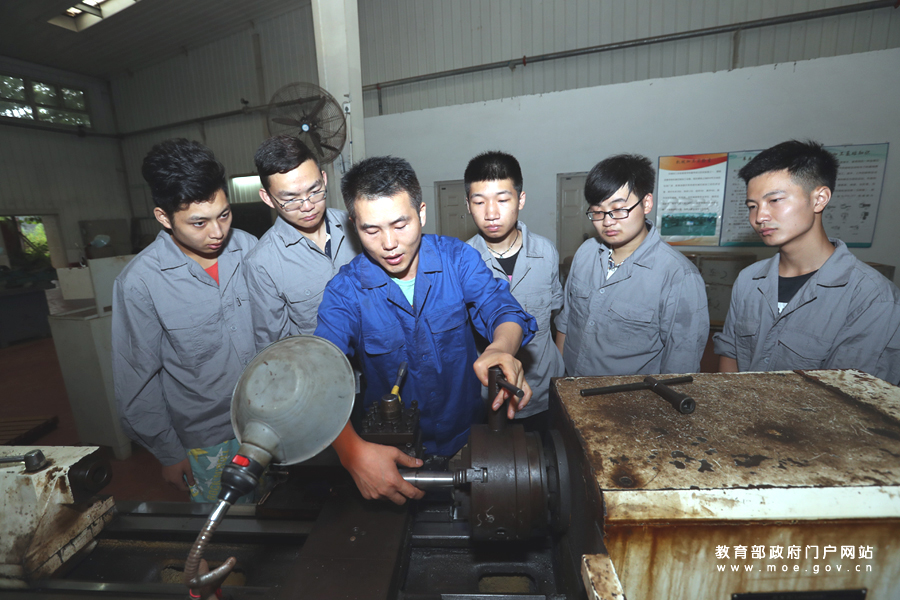在成都工業(yè)學院實訓中心車加工教學區(qū),雷金洲老師正在給該校材料工程學院汽車服務工程專業(yè)2016級的學生們演示普通臥式車床操作流程。(張勁松/攝 忠建豐/文)