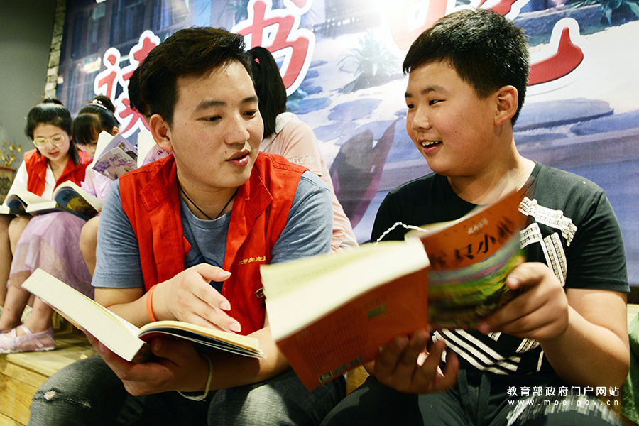 江蘇大學(xué)志愿者與外來務(wù)工人員子女在新華書店讀書吧交流讀書方法。(石玉成 徐洋/攝)