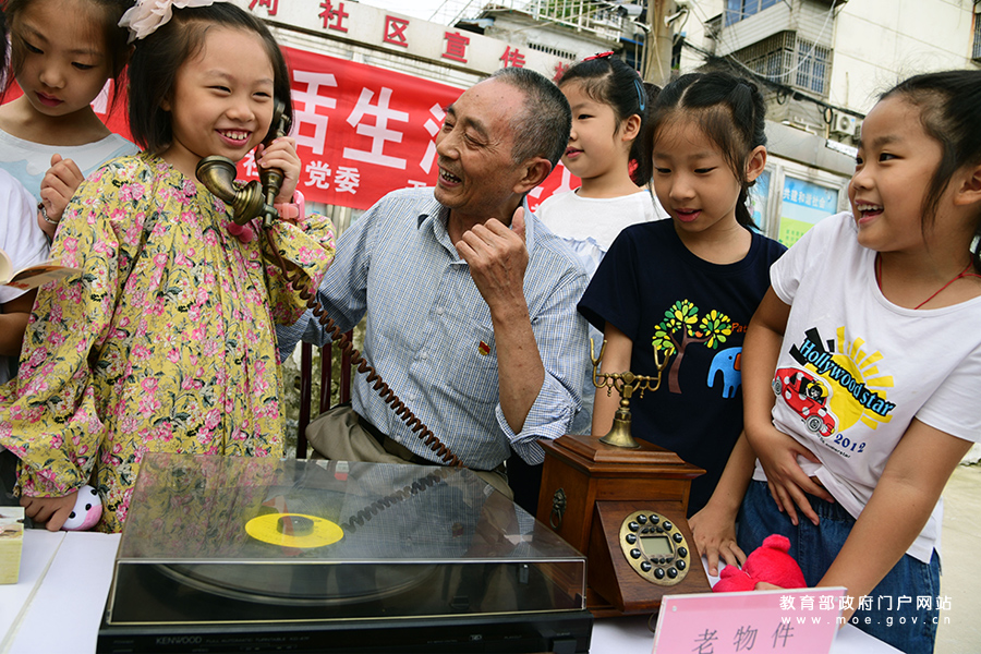 老黨員帶著小朋友體驗(yàn)老式電話機(jī)的使用。(石玉成/攝)