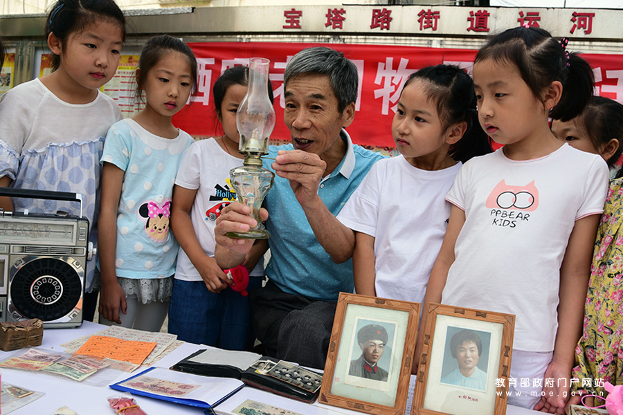 老黨員在向小朋友介紹煤油燈的使用方法。(石玉成/攝)