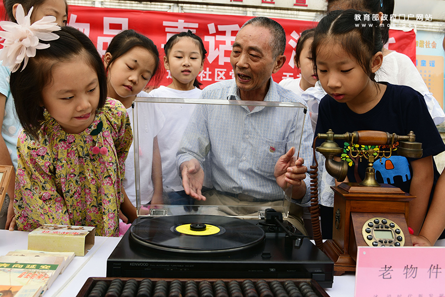 老黨員在向小朋友介紹老式電唱機(jī)的使用方法。(石玉成/攝)