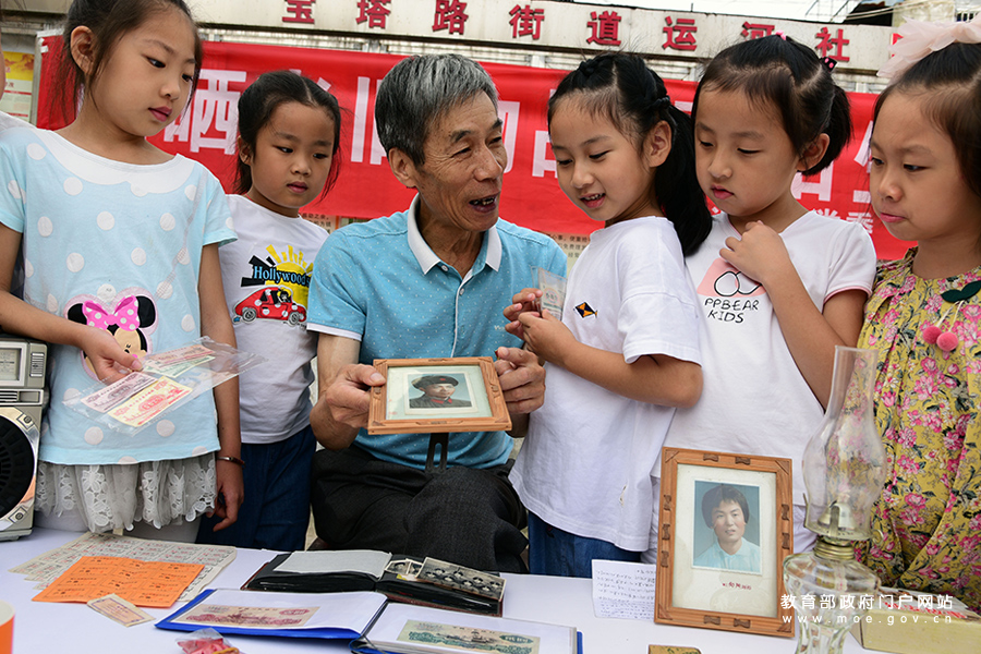老黨員在向小朋友介紹各種老舊物件。近日,江蘇省鎮(zhèn)江市寶塔路街道運(yùn)河社區(qū)開展“曬曬老舊物品 喜話生活變遷”主題活動(dòng),邀請(qǐng)老黨員為小朋友講解老舊電器、老票據(jù)、老照片、煤油燈等各種老舊物品,讓孩子們感受改革開放以來百姓生活的巨大變化。(石玉成/攝)