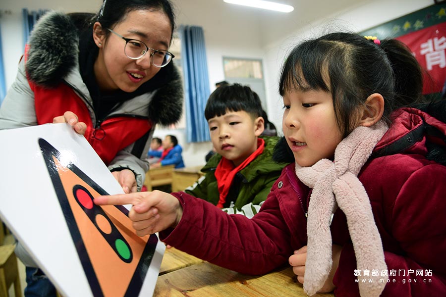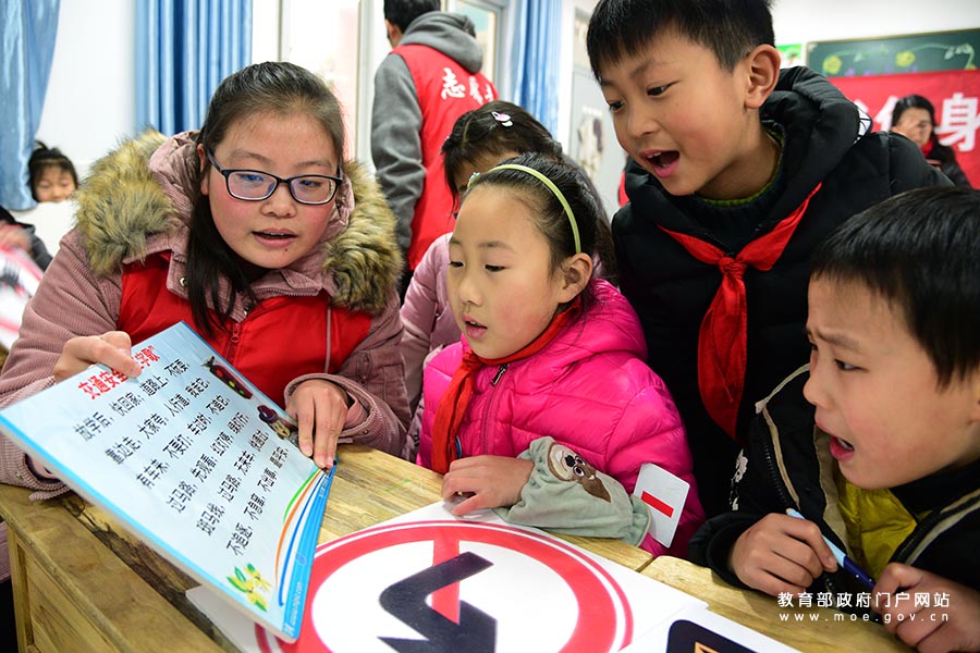 1/0江蘇大學(xué)志愿者在鎮(zhèn)江市李家大山小學(xué)通過(guò)交通標(biāo)識(shí)指導(dǎo)小學(xué)生學(xué)習(xí)交通安全知識(shí)。(石玉成/攝)
