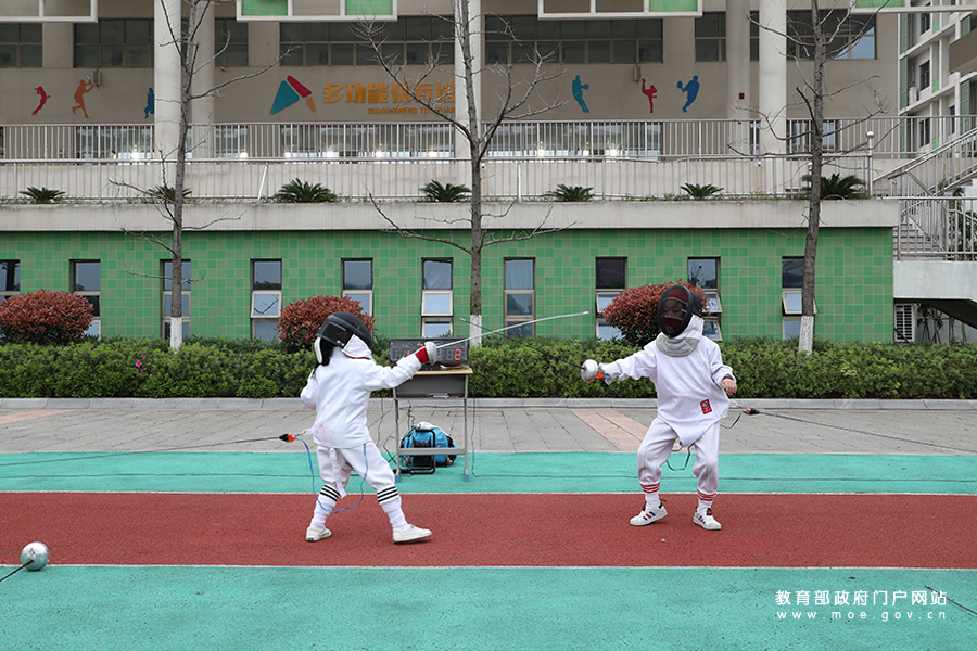 學(xué)生模擬擊劍實(shí)戰(zhàn),感受比賽時(shí)的緊張氣氛,培養(yǎng)學(xué)生為勝利奮進(jìn)拼搏的品格。(張勁松/攝 姚振/文)