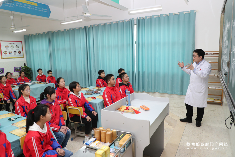 在中醫(yī)專業(yè)老師的講解下,初二年級(jí)的學(xué)生認(rèn)真學(xué)習(xí)中醫(yī)的基本知識(shí),感受傳統(tǒng)中醫(yī)藥文化。(張勁松/攝 姚振/文)