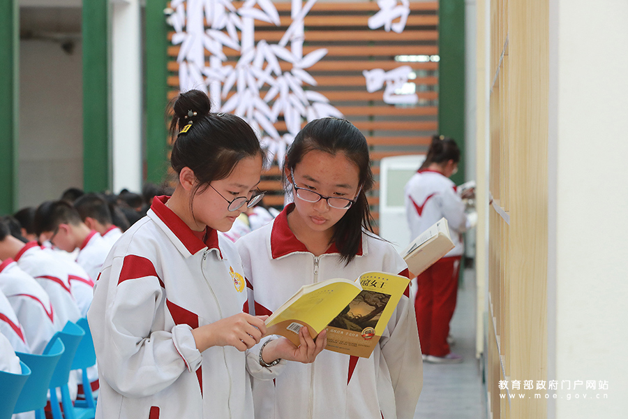 下午的課后閱讀時間,西朱中學校園內隨處可見邊閱讀邊交流的學生。(李智梅 張學軍/攝)