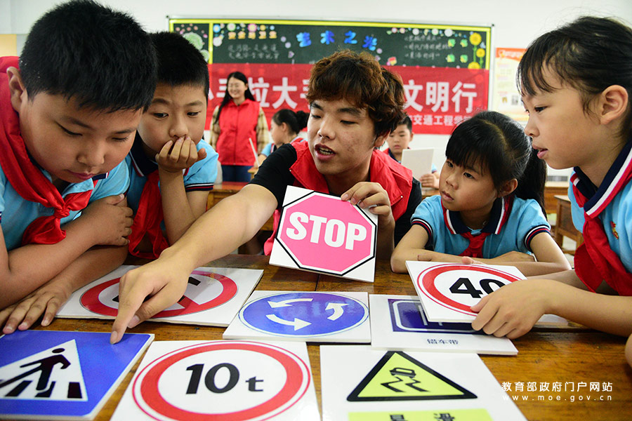 1/0暑假臨近,江蘇大學(xué)志愿者走進(jìn)鎮(zhèn)江市南徐小學(xué),開(kāi)展“學(xué)交通知識(shí) 度快樂(lè)暑假”活動(dòng)。志愿者通過(guò)模擬高架橋路況場(chǎng)景、講解交通標(biāo)志含義,指導(dǎo)小學(xué)生學(xué)習(xí)交通安全知識(shí),增強(qiáng)安全意識(shí),快樂(lè)文明度暑假。(石玉成 豐德/攝)
