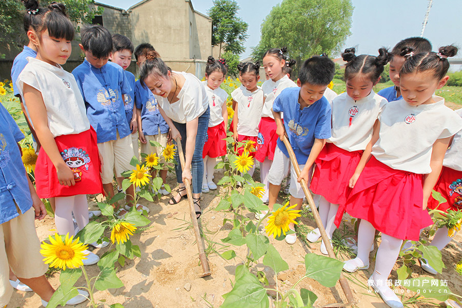 1/07月3日,江蘇省徐州市玉潭實(shí)驗(yàn)學(xué)校的老師帶領(lǐng)學(xué)生體驗(yàn)松土勞動。暑假,學(xué)校開展研學(xué)實(shí)踐活動, 孩子們在親近自然、體驗(yàn)農(nóng)耕的同時(shí)增長了知識,養(yǎng)成了熱愛勞動的習(xí)慣。該校利用校園內(nèi)的空閑地塊開辟了勞動實(shí)踐基地,推出了以學(xué)習(xí)農(nóng)業(yè)生產(chǎn)知識為內(nèi)容的“第二課堂”。(蒯創(chuàng)/攝)