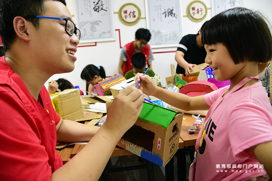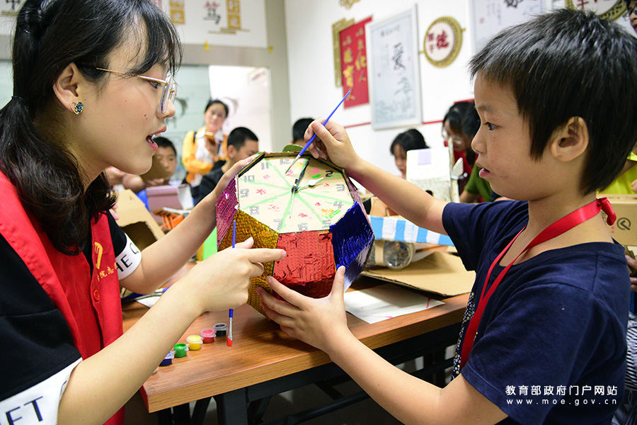 1/0江蘇大學(xué)志愿者在指導(dǎo)小朋友用廢舊快遞盒制作工藝品。正值暑假,江蘇大學(xué)的志愿者走進(jìn)鎮(zhèn)江市寶塔路街道金橋社區(qū),開展“快遞盒‘變廢為寶’倡環(huán)保”活動(dòng),指導(dǎo)小朋友們用收集的快遞盒制作鐘表、汽車模型等創(chuàng)意環(huán)保工藝品。孩子們在活動(dòng)中增強(qiáng)了動(dòng)手能力,培養(yǎng)了節(jié)約資源的環(huán)保意識,豐富了假期生活。(石玉成 周存君/攝)