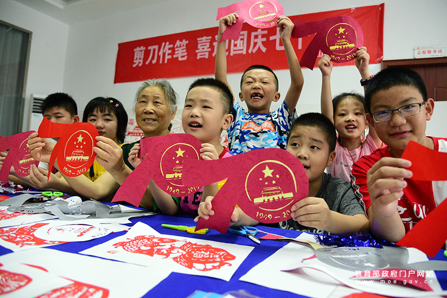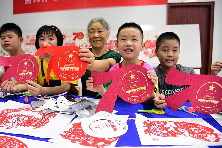 尹桂蘭和小朋友們一起展示“慶祝中華人民共和國成立70周年活動(dòng)標(biāo)識(shí)”剪紙作品。(石玉成/攝)