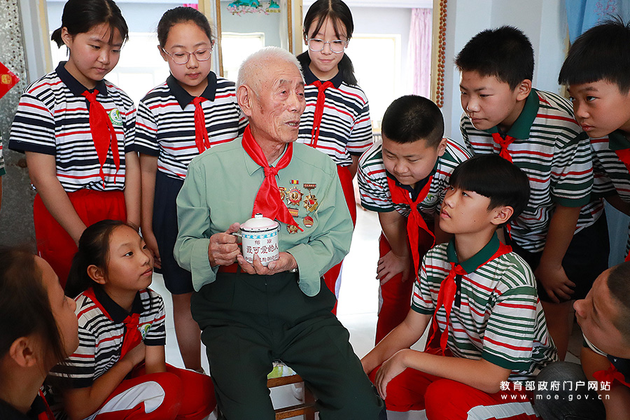8月21日,志愿軍老戰(zhàn)士劉福明向建國(guó)街小學(xué)學(xué)生講述志愿軍戰(zhàn)斗故事。(宋強(qiáng)、張學(xué)軍/攝)