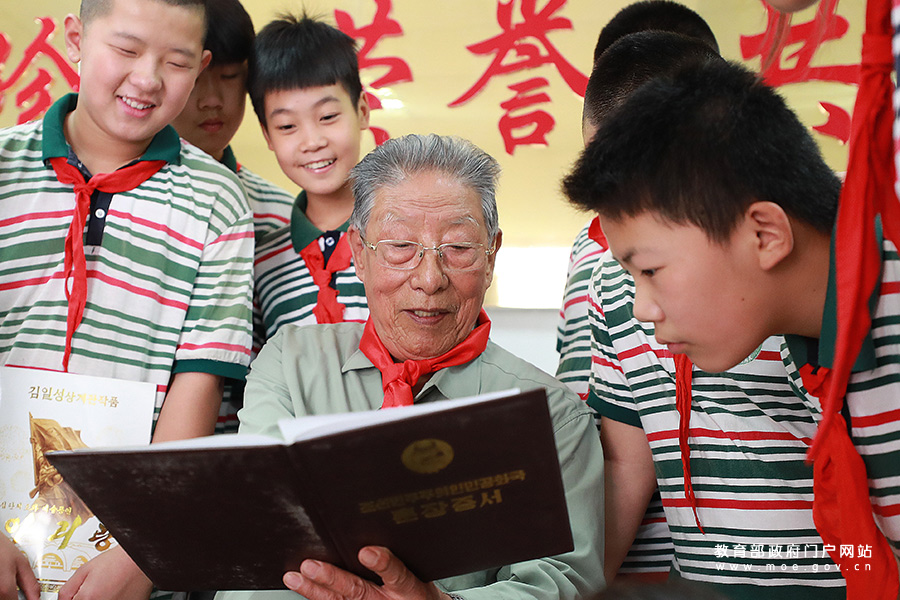 8月21日,志愿軍老戰(zhàn)士楊文有向建國(guó)街小學(xué)學(xué)生介紹參加朝鮮60年國(guó)慶慶典情況。(宋強(qiáng)、張學(xué)軍/攝)