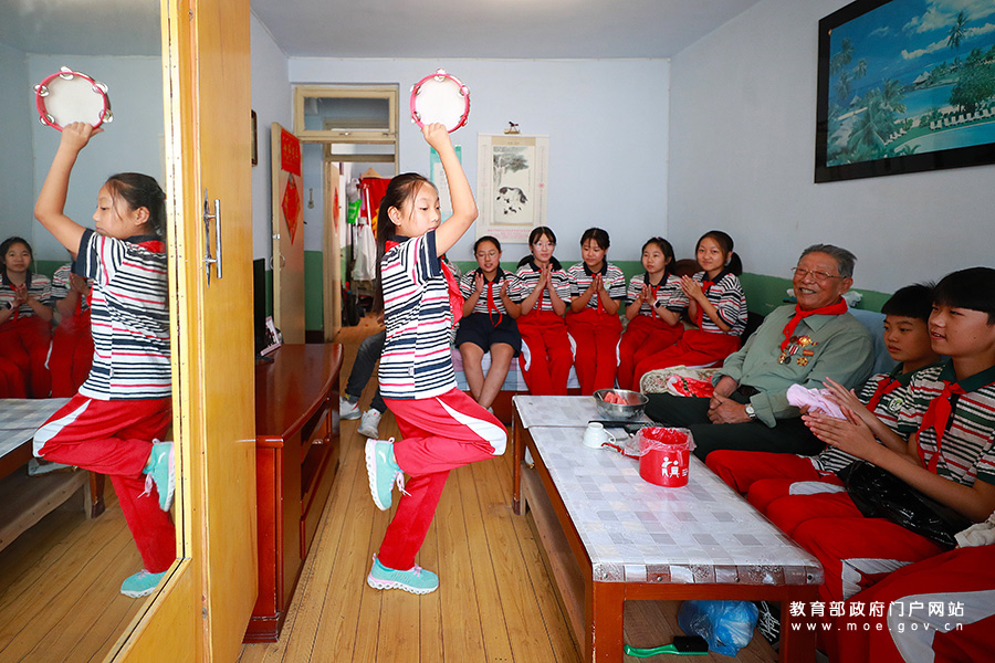 8月21日,建國(guó)街小學(xué)學(xué)生為老英雄楊文有表演小節(jié)目。(宋強(qiáng)、張學(xué)軍/攝)