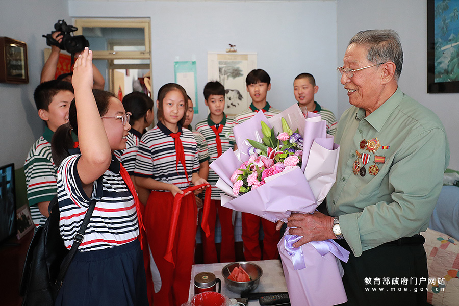 8月21日,建國(guó)街小學(xué)學(xué)生向老英雄楊文有獻(xiàn)花。(宋強(qiáng)、張學(xué)軍/攝)