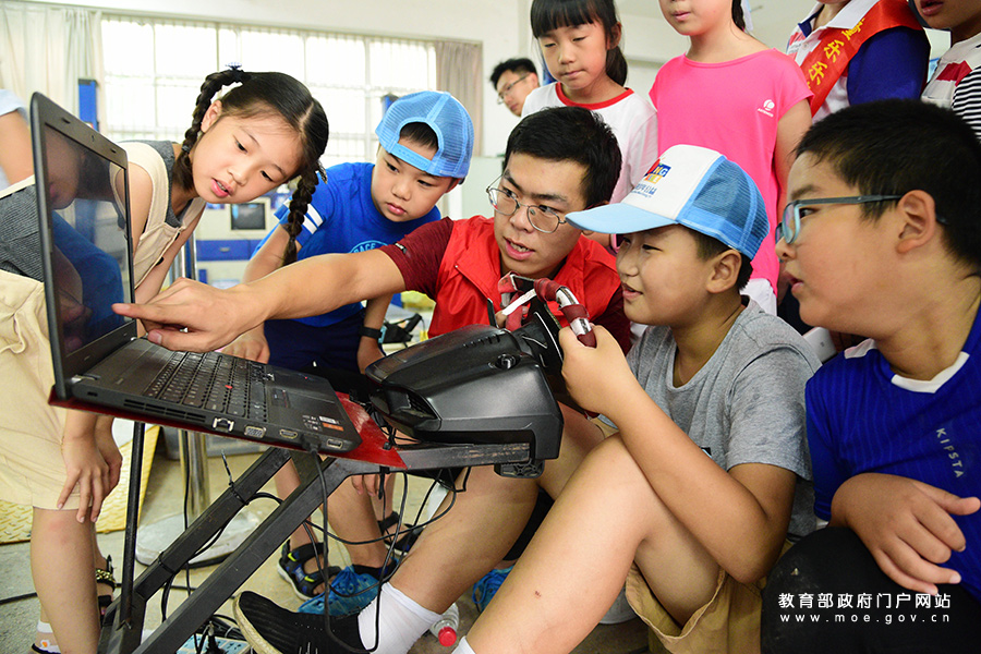 暑假期間,江蘇省鎮(zhèn)江市寶塔路街道車站社區(qū)20多名小朋友走進(jìn)江蘇大學(xué)大學(xué)生方程式賽車設(shè)計(jì)制造實(shí)驗(yàn)室,在志愿者指導(dǎo)下親密接觸方程式賽車,學(xué)習(xí)賽車知識,感受科技魅力。(石玉成、豐德/攝)