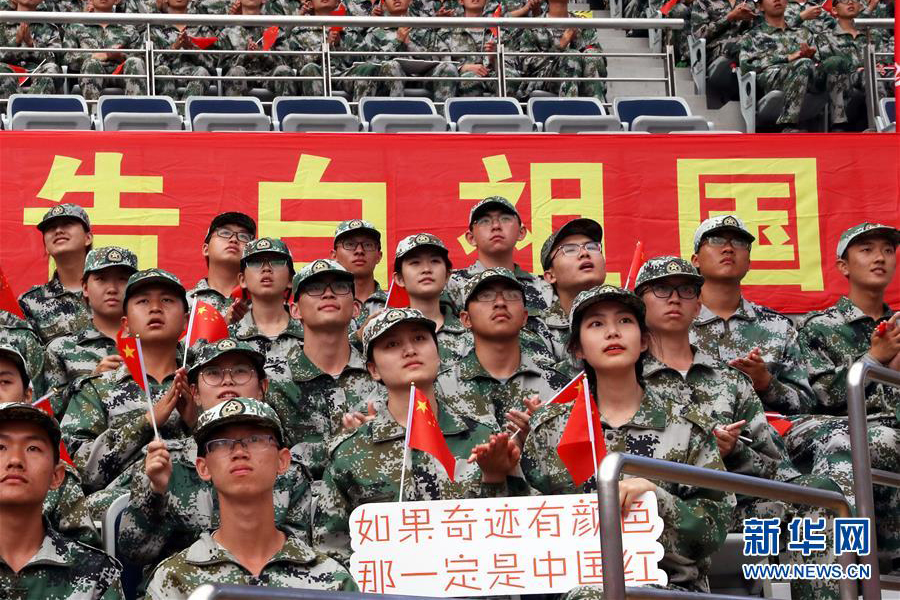 1/0復(fù)旦大學(xué)學(xué)生在2018級(jí)學(xué)生軍訓(xùn)中秋文藝匯演上“告白祖國(guó)”(9月13日攝)。 (新華社記者 劉穎/攝)