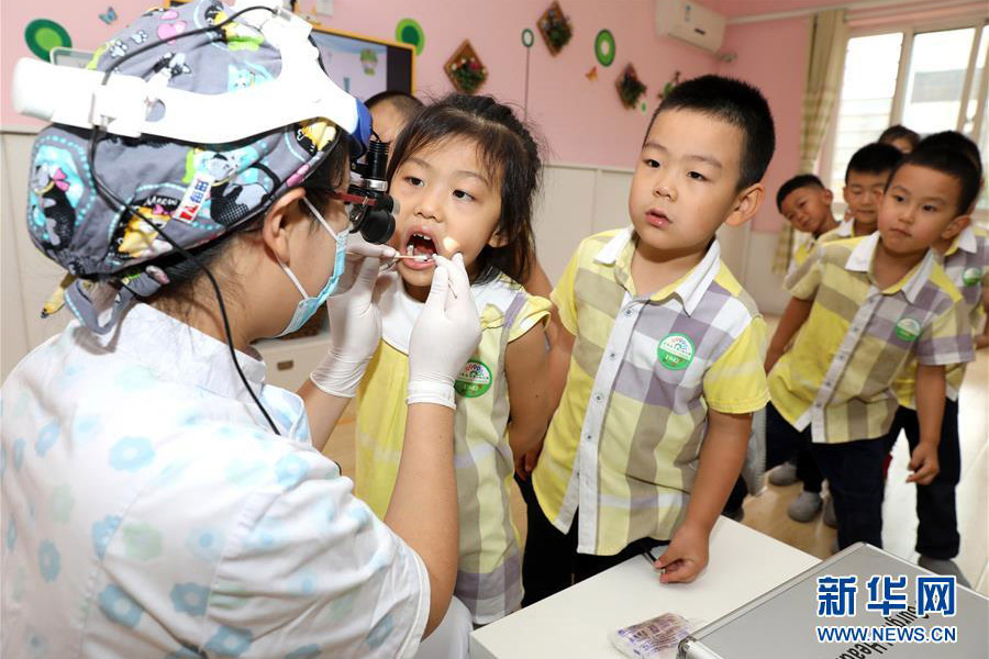 9月19日,醫(yī)護人員在石家莊市第一幼兒園為小朋友檢查口腔。(新華社記者 朱旭東/攝)