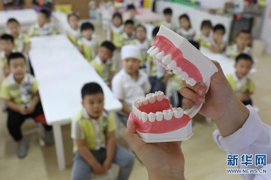 9月19日,醫(yī)護人員在石家莊市第一幼兒園為小朋友講解口腔健康知識。(新華社記者 朱旭東/攝)