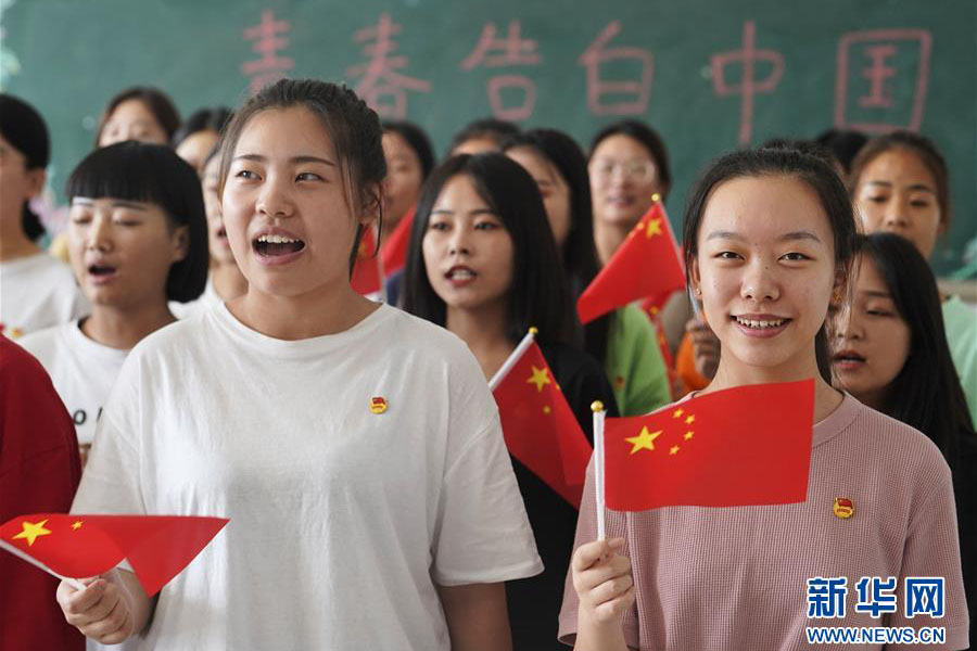 1/09月18日,邢臺技師學院的學生參加快閃活動“我和國旗有個約會”。 當日,河北省邢臺技師學院開展“青春告白中國”活動,學生們通過唱歌、快閃、專業(yè)課程等形式,表達對祖國的熱愛和祝福。(新華社記者 邢廣利/攝)