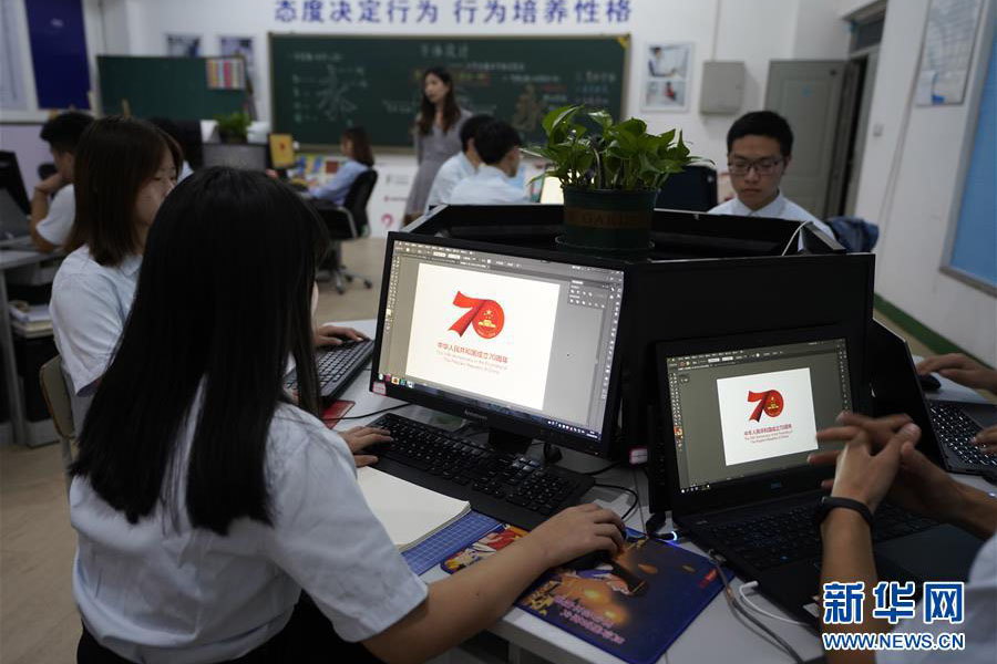 1/09月18日,邢臺技師學院的學生在平面設(shè)計課程上臨摹慶祝中華人民共和國成立70周年活動標識。(新華社記者 邢廣利/攝)