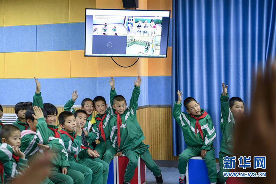 1/010月9日,寧夏固原市涇源縣涇河源鎮(zhèn)白面民族小學(xué)師生在課堂教學(xué)的同時(shí),與當(dāng)?shù)馗叻宕濉准褰虒W(xué)點(diǎn)的學(xué)生進(jìn)行網(wǎng)絡(luò)在線互動(dòng)。地處寧夏西海固地區(qū)的涇源縣近年來大力發(fā)展“互聯(lián)網(wǎng)+教育”,積極構(gòu)建數(shù)字化教育共享平臺(tái),推動(dòng)城鄉(xiāng)優(yōu)質(zhì)教育資源互通共享,不斷縮小城鄉(xiāng)教育差距。目前,寧夏固原市涇源縣已建設(shè)智慧校園試點(diǎn)校11所,建成智慧云教室106間,“一拖二”網(wǎng)絡(luò)在線互動(dòng)課堂26個(gè),全縣中小學(xué)400兆網(wǎng)絡(luò)實(shí)現(xiàn)全覆蓋。(新華社記者 馮開華/攝)